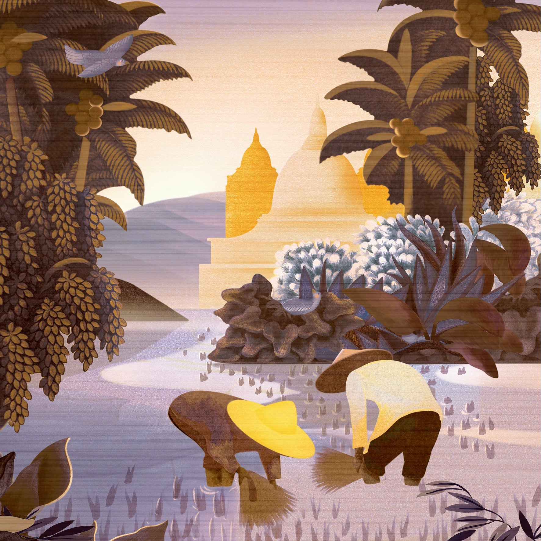 Hills of Sapa représente une vaste scène orientale dans les rizières de Sapa au Viêt-Nam, imprimée sur un fond à l’aspect soie dupion. Cette œuvre panoramique allie finesse artistique et finition luxueuse.