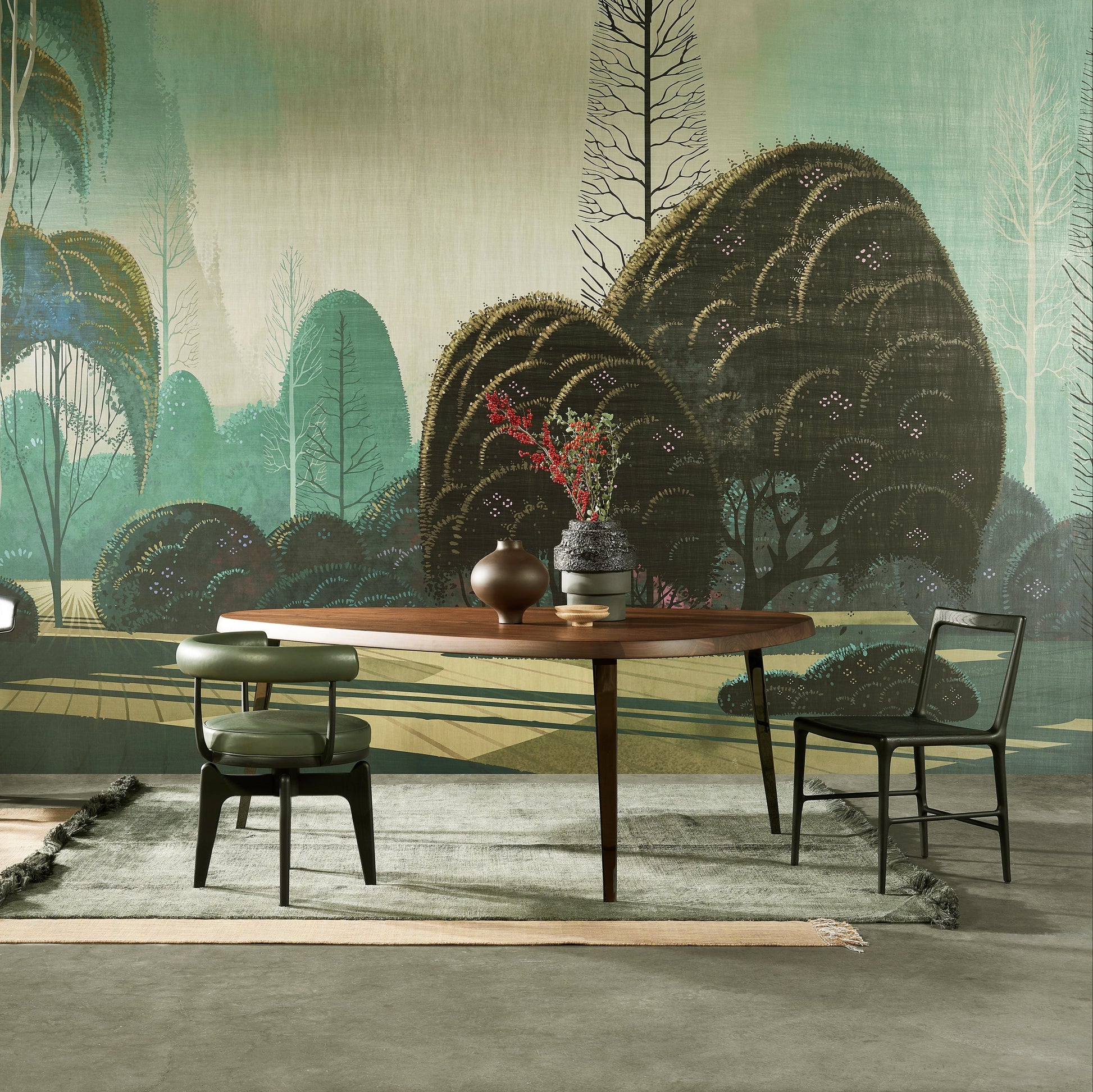 Le Jardin Mystique évoque une aube dorée devant un fond de forêt brumeuse, mêlant mystère et élégance. Le décor peint à la main, imprimé sur un revêtement textile sur intissé, invite à la contemplation et à la rêverie.
