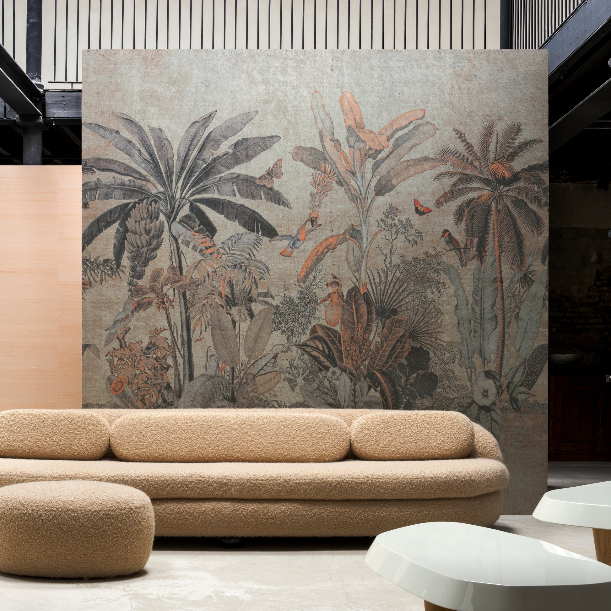 Milk and Honey déploie une scène paradisiaque peuplée de colibris, perroquets et singes, imprimée sur un fond effet parchemin pour un rendu vintage unique.