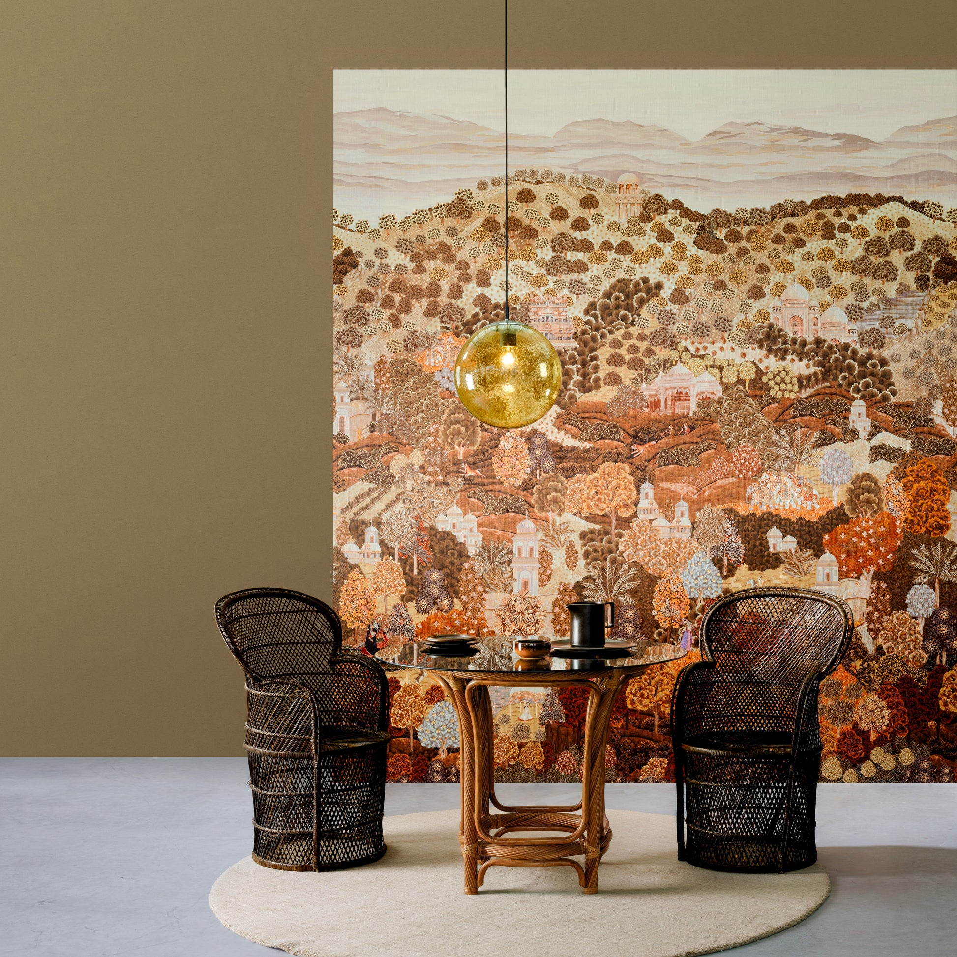 Sundara s’inspire de la région du Rajasthan en Inde, représentant un panorama somptueux aux couleurs chaudes, imprimé sur un support textile fil‑à‑fil luxueux. Ce décor mural crée une ambiance raffinée et exotique, parfaite pour un mur d’accent élégant.