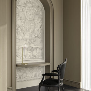 Le revêtement mural Greenhouse Gathering Arch de la maison Arte s’inspire des moulures décoratives et de l’architecture des serres anciennes. Son design reproduit la sensation de regarder à travers des arches vitrées, révélant un univers de fleurs luxuriantes et de détails cachés qui apparaissent en observant de plus près. Imprégné du charme de l’Art déco, il se décline dans une palette monochrome rappelant le plâtre sculpté. Grâce à son aspect suède doux, ce revêtement mural apporte une dimension tactile raffinée et transforme vos murs en une composition architecturale élégante.