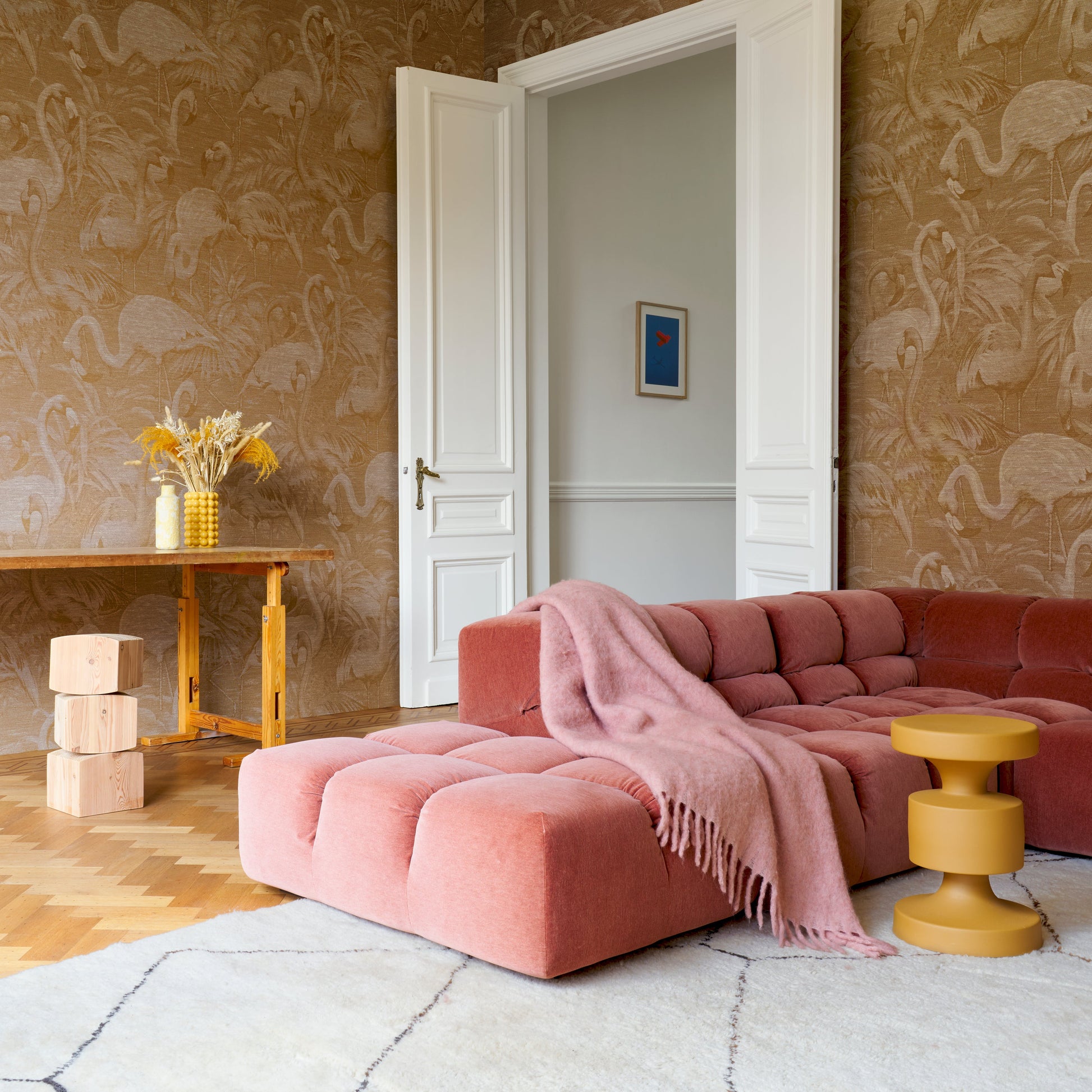 Flamencos Andinos met en scène un groupe gracieux de flamants roses, imprimé sur un support textile haut de gamme en jute tissé naturel, pour un décor mural à la fois flamboyant et apaisant.
