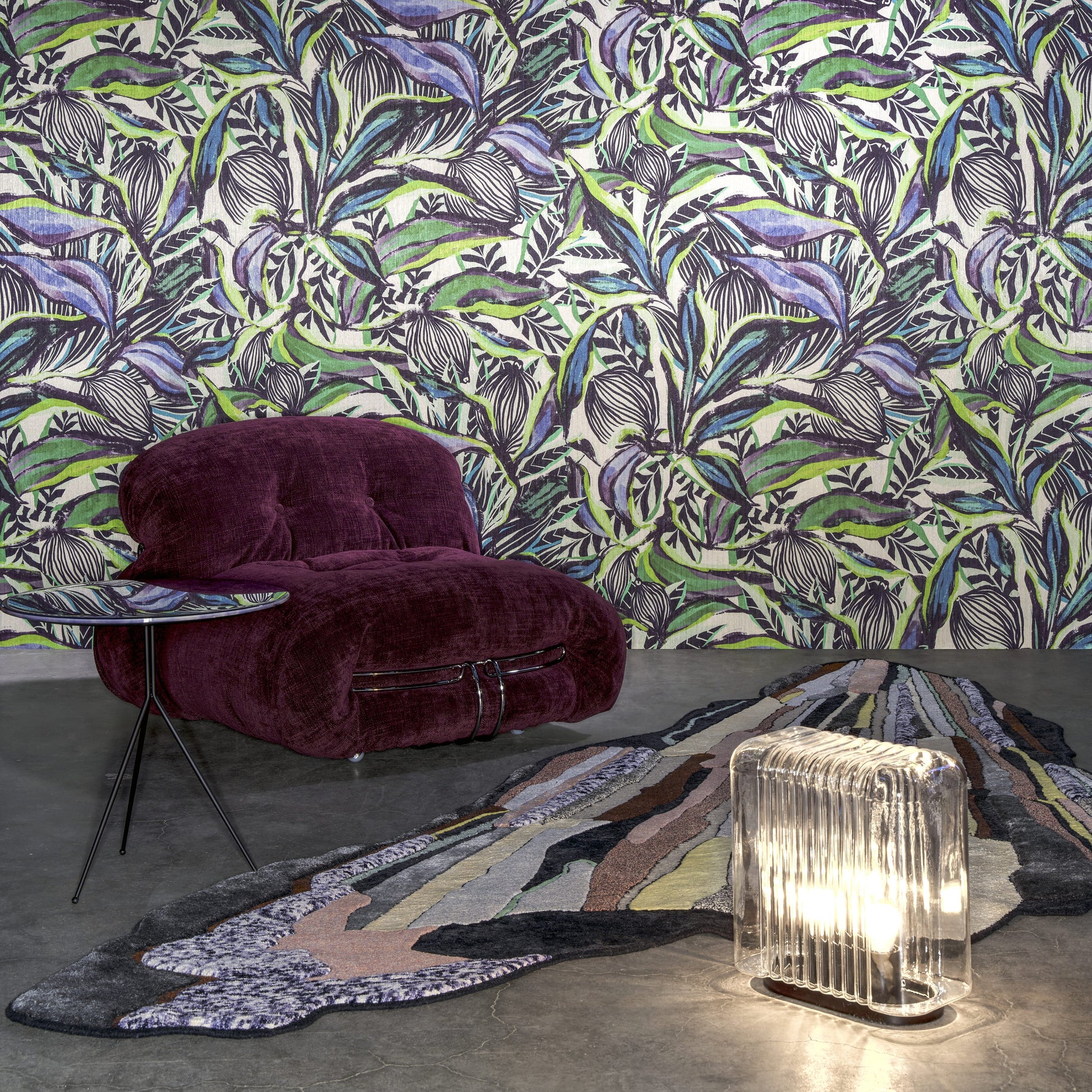 Flor Imaginaria présente un décor tropical éclatant inspiré de la plante « lanterne » (Physalis), avec une technique fil-à-fil verticale et des couleurs influencées par les tissus wax africains. Cette pièce apporte une énergie haute en couleur à vos murs.