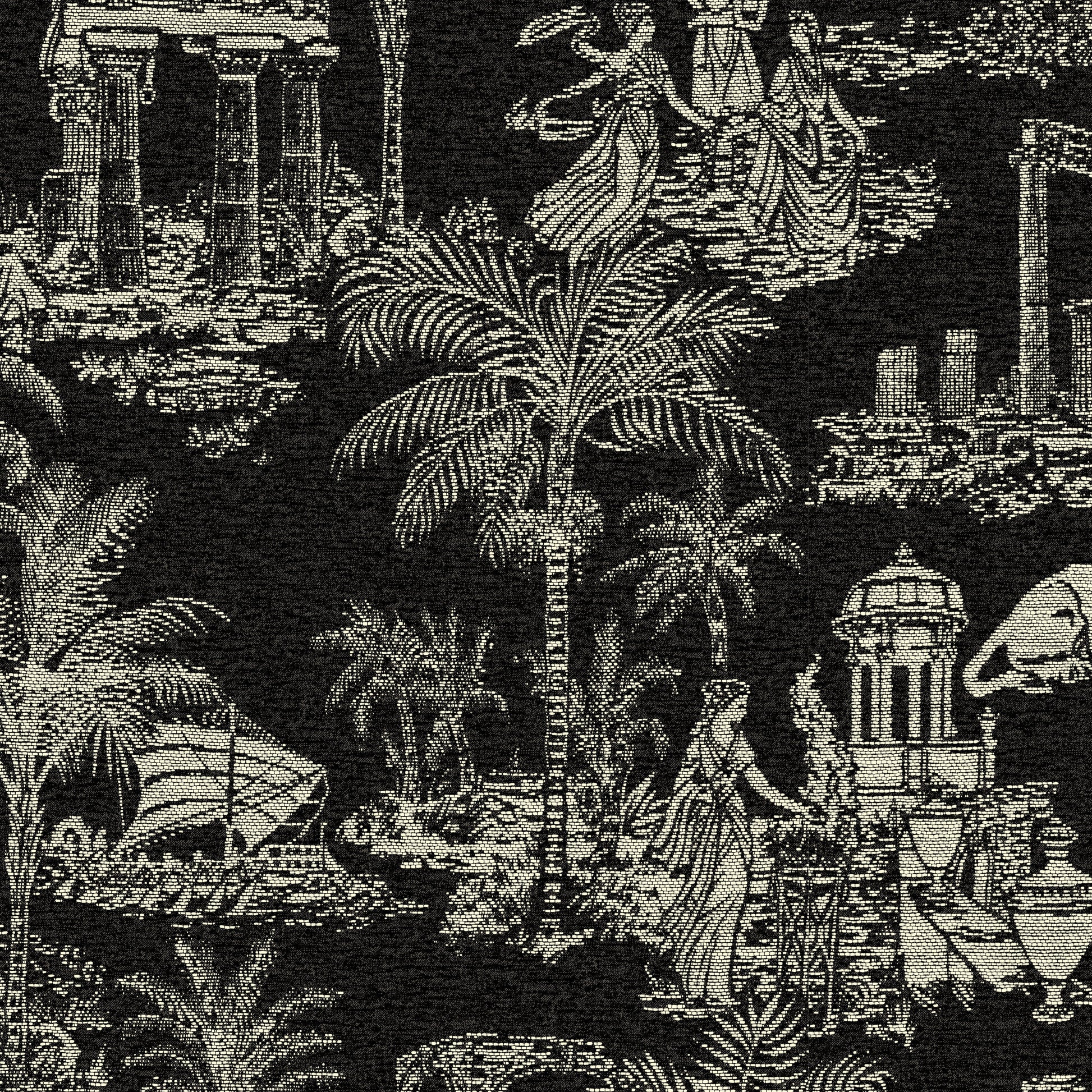 Mythologie Grecque évoque l'antique civilisation grecque à travers un décor raffiné en jute tissé, mêlant temples majestueux, palmiers et figures mythologiques dans un style monochrome inspiré de la toile de Jouy.